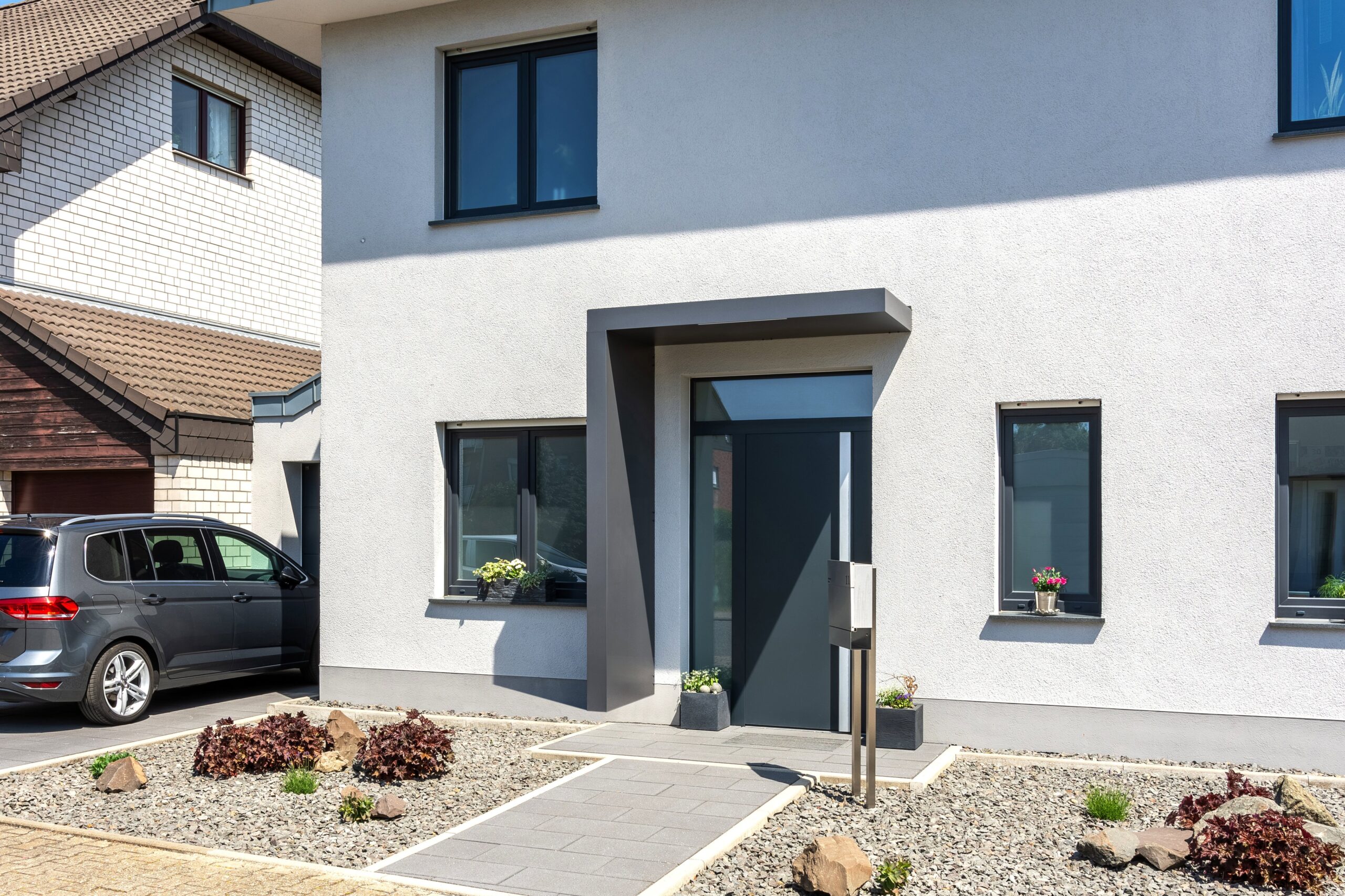Das Front Line Vordach von VD AluSysteme verleiht Ihrem Eingangsbereich eine klare, modern-zeitlose Optik. Die Konstruktion besteht aus pulverbeschichtetem Aluminium (standardmäßig in Anthrazit Feinstruktur), kombiniert mit einer hochwertigen Füllung aus EPS-Dämmplatten. Diese sorgt nicht nur für eine elegante Oberfläche, sondern reduziert zugleich effektiv die Geräuschentwicklung bei Regen oder Hagel.